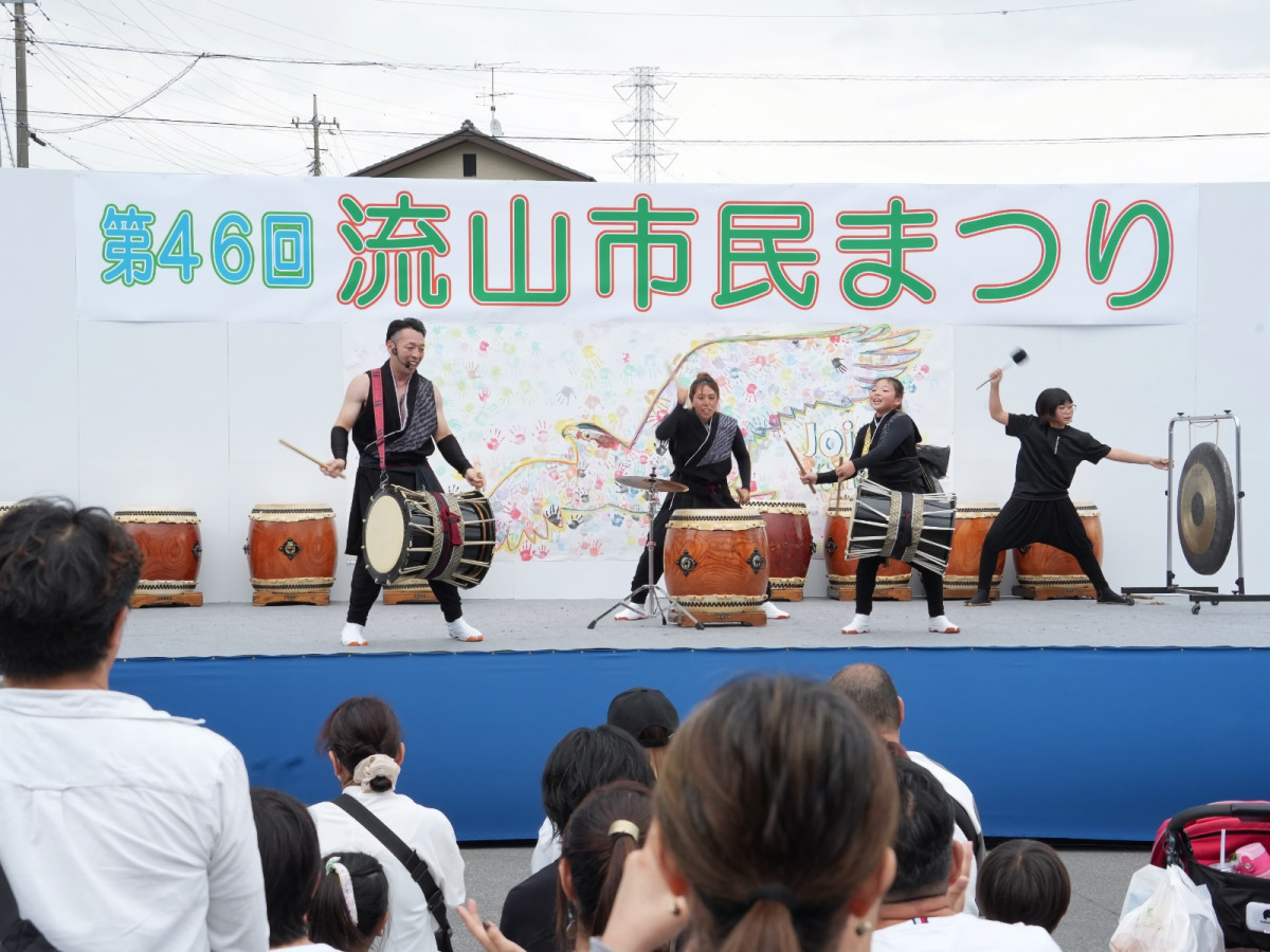 前回の「流山市民まつり」の閉会セレモニーで行われた「和太鼓一家 武志(ぶし)」のパフォーマンス