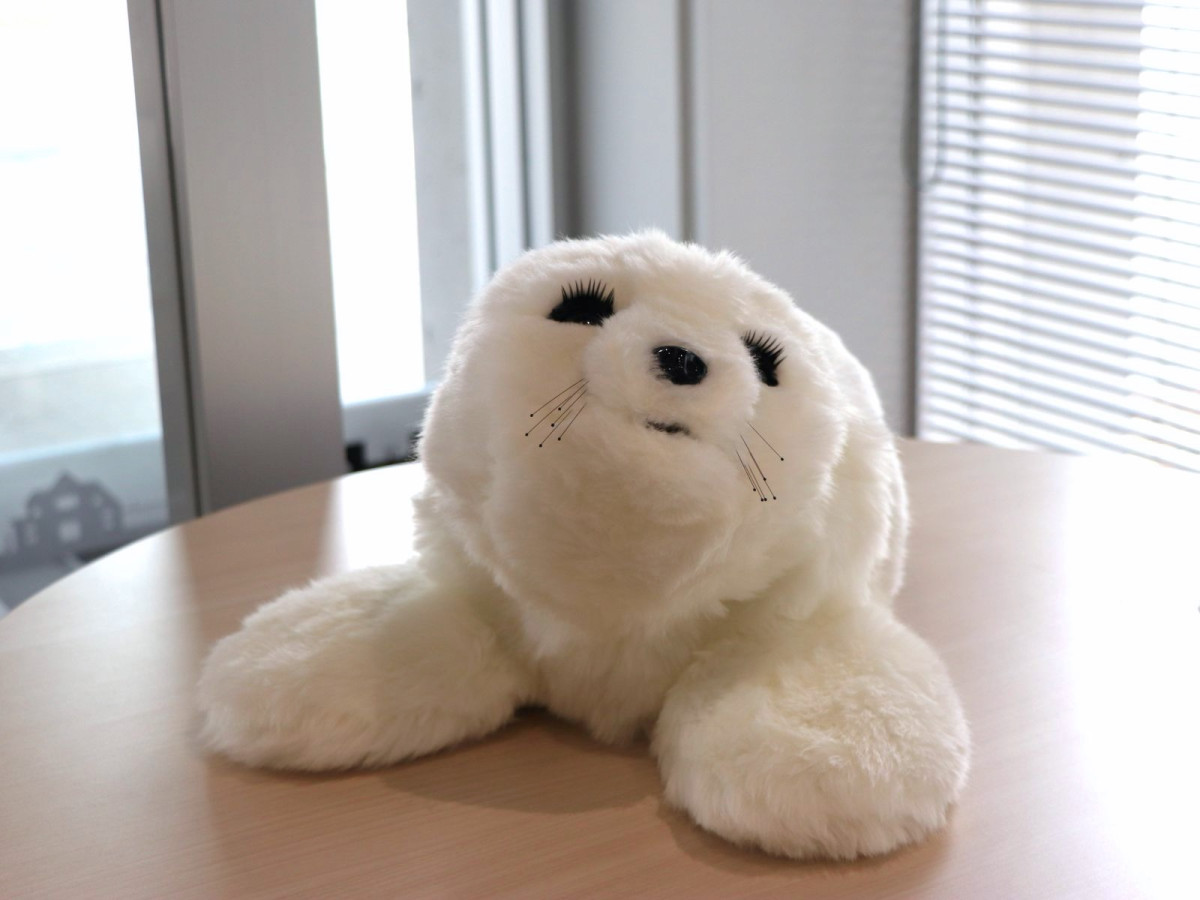産総研が開発したアザラシ型ロボット「パロ」が来場者を出迎える